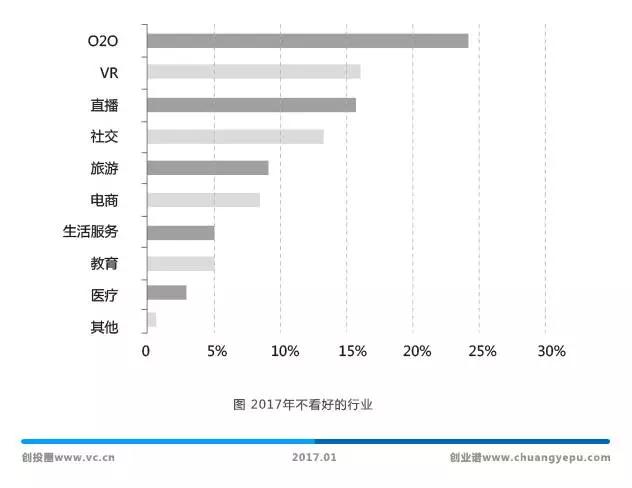 在“2017最不看好的领域”的调研中,O2O,VR,直播排名前三位,社交、旅游、电商在第四至六位。