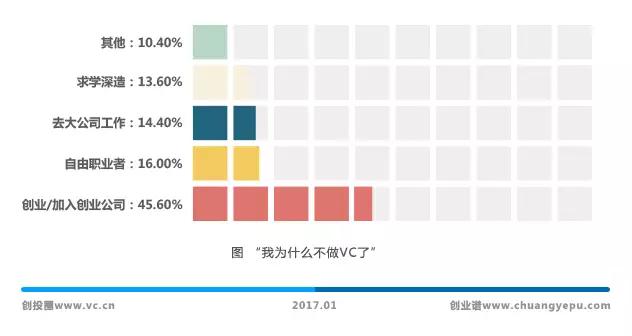 对于“如果不做投资,会做什么”的问题,45.6%的被调研投资人选择创业或加入创业,可见创业者和投资人的身份转换在当前成为主流。投资人在见了很多创业项目后,对项目成功的概率更有把握,2016涌现出一批“投而优则创”的代表,如英雄互娱总裁吴旦,熊猫TV副总裁庄明浩,36kr媒体总裁冯大刚等。