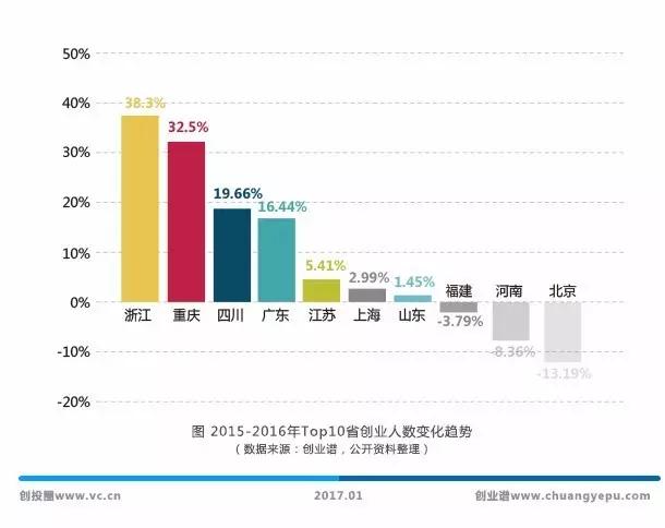 调研显示,在创业人数排名前十的省份中,2015-2016年出现了不同的变化趋势,其中浙江、重庆、四川成为创业人数增长最快的区域,增速分别为38.3%、32.5%和19.66%,与此同时,北京、河南、福建成为创业人数减少最快的区域,分别减少了13.19%、8.36%和3.79%,报告分析,资本寒冬对不同地区的创业带来了不同影响,北京等创业过热的区域,一部分泡沫正在挤去,而西部等原本创业氛围较弱的地区,新的创业热潮正在兴起。
