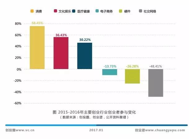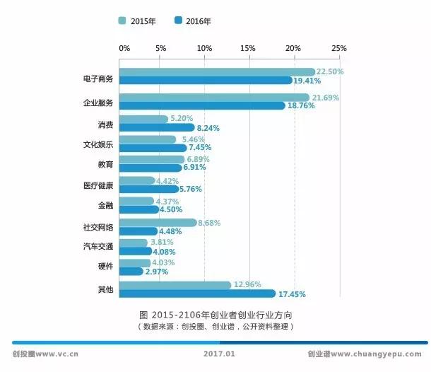 调研显示,2016年创业者主要创业行业中,电子商务和企业服务占比最高,分别约占20%。2015-2016年主要创业行业的变化显示,消费、文化娱乐和医疗健康行业创业者增长最快,分别为58.45%、36.43%和30.22%,社交网络、硬件和电子商务创业者减少最快,分别为48.41%、26.28%和13.73%。