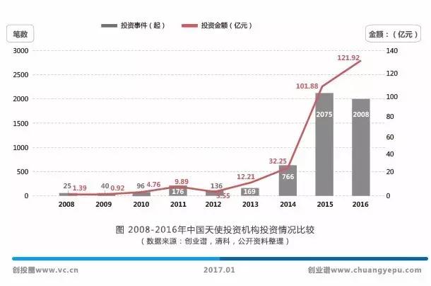 “我们发现,虽然整体市场处于资本寒冬中,但具体到专注于早期投资的天使投资机构,投资金额并没有减少,”16日在北京举行的报告发布会上,创投圈CEO、天使投资人李晓宁表示,统计显示,2016年中国天使投资机构投资起数是2008起,比2015年的2075起略有减少,投资金额是121.92亿元,比2015年的101.88亿元增长了20%,对于希望获得早期天使投资的创业者而言,是一个鼓舞人心的数据。
