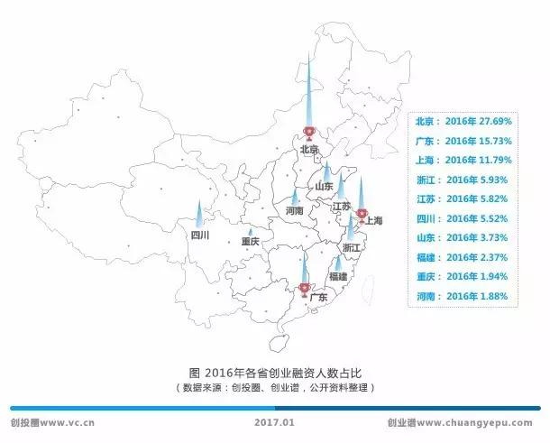 报告显示,2016年各省创业融资人数占比中,北京、广东、上海分别为27.69%、15.73、11.79%,在最容易获得创业融资的省份排行榜中,三地成为创业融资最为密集的区域。