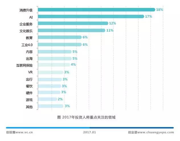 调查显示,2017年投资人特别关注的领域中,消费升级、人工智能和企业服务排名前三位。居首位的消费升级领域占16.19%,2016是消费生活服务的拐点,资本将重点从生活化服务产品转向了垂直领域的消费升级产品,更加青睐强调流量的精准产品,2017年将延续这一趋势。第二至五位分别为人工智能、企业服务、文化娱乐和教育。