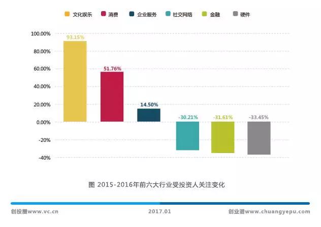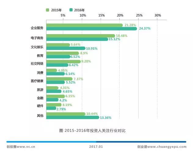 报告对投资人的调研发现,2016年投资人最关注的方向分别是企业服务,电子商务和文化娱乐,占比分别为24.37%,18.48%和10.91%。2015-2016年期间,投资人最关注的六大行业中,文化娱乐、消费和企业服务的关注人数上升最快,硬件、金融和社交网络的关注人数下降最快。