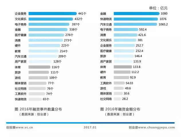 公开数据统计显示,2016年度细分行业融资事件排行榜中,企业服务以441个融资案例居首位,紧随其后的是文体娱乐和电子商务,融资案例分别为432和397个, 三者总和占比达到36%,金融和医疗健康分别以276和273个居第四、五位。