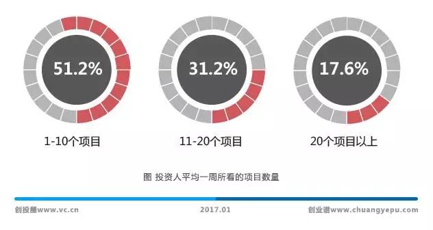 2016年资本寒冬的形势,从投资项目的数量上可以得到明显印证。接受调研的投资人中,接近半数的投资人每周看10个以上项目,其中超过三成每周看11-20个项目,每周看20个以上项目的占近二成,反映出大部分的投资人相当勤奋地在deal source。