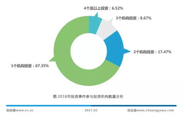 作为应对资本寒冬的策略,投资机构抱团取暖,联合投资的比例大大提高,调研显示,2016年投资事件中,机构合投的数量占比约三成五,其中2个机构参与投资的占17.47%,三个机构的占8.67%,4个及以上机构的占6.52%。