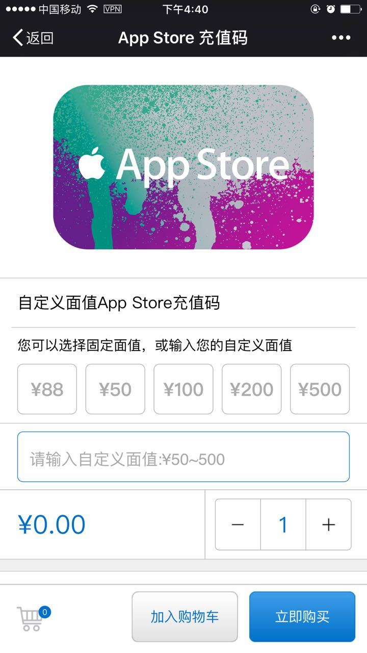 在官方公众号中,有购买充值卡的模块,充值卡主要分为50元、80元、100元、200元和500元五类固定面值,另外还有50-500元的自定义面值。通过微信支付,用户可以直接购买礼品卡,而不需要登录苹果的封闭系统进行操作。