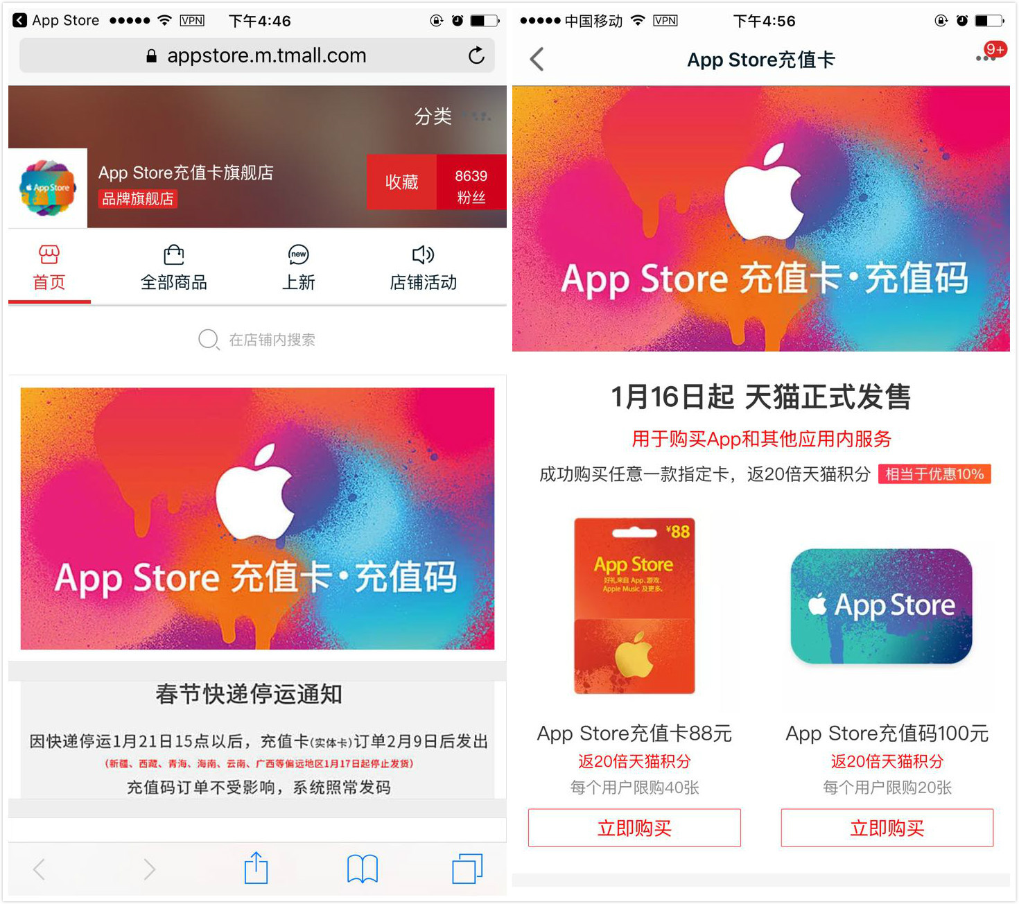 早在今年1月10日,苹果宣布 App Store 充值卡在中国开售,即日起至 1 月 15 日都可以在天猫的 App Store 充值卡旗舰店直接预订,从1月16日起正式开售。该店铺显示,成功购买任意一款指定卡,可返20倍天猫积分。