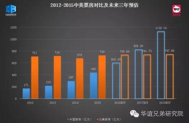 据华谊兄弟研究院数据,按照近4年票房年均复合增长率37.03%的增长速度,千亿规模的目标指日可待。也就是说,预计在2018年的时候,中国电影市场票房将超过1000亿元。而如果说超越美国,则有望在2017年即可达成(以2012年以来北美市场年均复合增长率0.8%计算),届时中国将成为全球第一大市场。