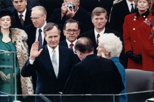 在 1989 -1993 年期间,老布什担任第 41 届美国总统,当时他使用了一本家里的圣经,翻开到马太福音第5章。