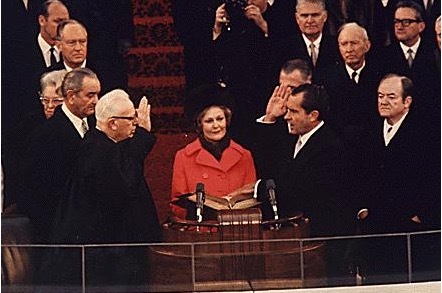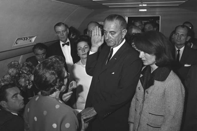 1963年11月22日,肯尼迪总统于达拉斯遇刺后,时任副总统的约翰逊在空军一号上、在肯尼迪夫人的注视下宣誓就职。约翰逊于 1963 至 1969 年期间任职。不知道他当时使用的是哪本圣经。