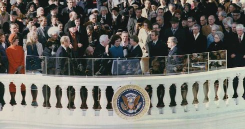 克林顿也连任两届总统。1993 年的总统就职仪式上,克林顿翻开了祖母赠送的钦定本圣经并宣读。1997 年克林顿再度任职,他以《以赛亚书》第 58 章 12 节的经文作为自己的就职誓言。图为克林顿第一次抚圣经宣誓。