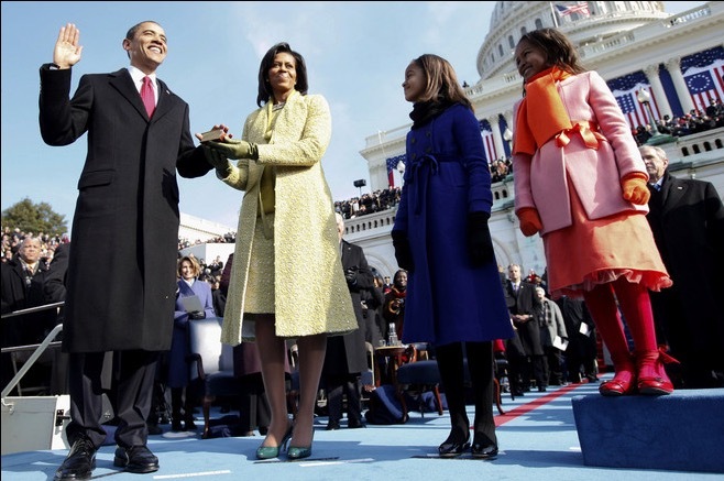同样也是把左手平行高举至头的动作,还是他 2009 年第一次宣誓就职。当年 1 月 20 日,奥巴马手按《圣经》宣誓就职,旁边是他的妻子米歇尔、女儿玛利亚和萨莎。
