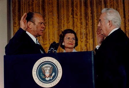 1974 年,福特总统上任,不过令人津津乐道的是他的副总统和总统之位都不是竞选取得的。1973年10月10日,当时的副总统 SpiroAgnew 因为涉及过去的受贿案被迫辞职,尼克松提名从议会退休的福特为副总统。接着,尼克松本人也因水门案辞职,福特顺利成为总统。