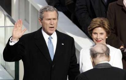 2001 年第一次宣誓入职总统的小布什,使用了一本家里的圣经,不过在宣誓仪式上,他并没有打开。到 2005 年再次任职的小布什,翻开了之前的那本圣经并宣读了《以赛亚书》40章31节的经文:“但那等候耶和华的必重新得力。他们必如鹰展翅上腾;他们奔跑却不困倦,行走却不疲乏。”下图为第二次宣誓就职。