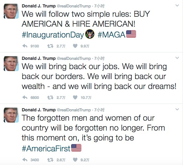 又到一年美国总统就任日,美东时间 1 月 20 日白天(北京时间 1 月 21 日凌晨 1 点左右),喜欢在 Twitter 上“点兵点将”的特朗普,终走向台前,宣誓就职美国第 45 任总统。