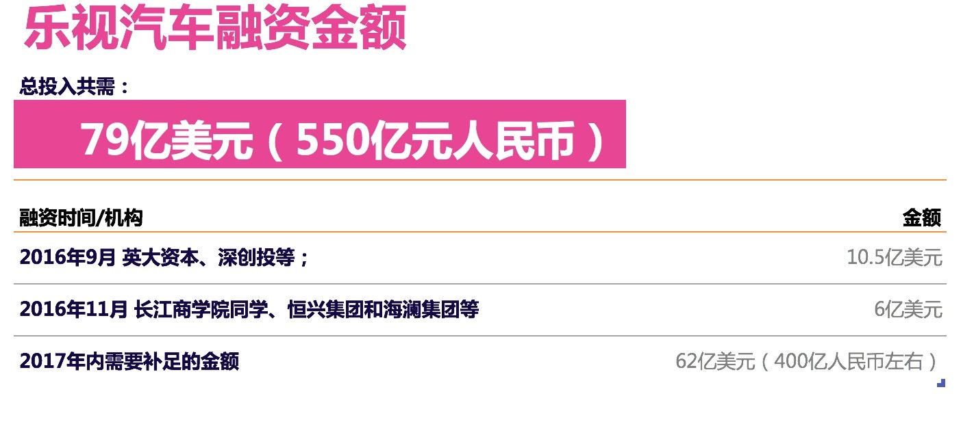 前后两笔融资总计在120亿元人民币左右。和贾跃亭所估计的投入相比,还有300至400亿左右的资金缺口。