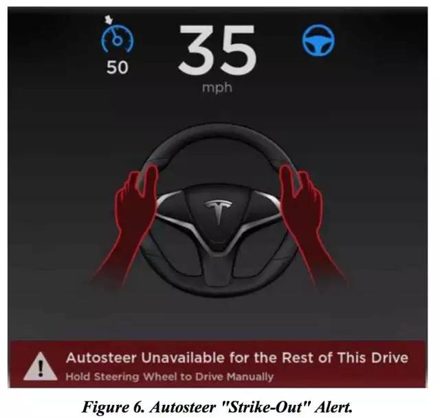“strike out”策略进一步加强驾驶员参与驾驶的需求。没有对驱动器监视系统警报中的视觉提示作出响应的驾驶员可能在驾驶周期的剩余时间遭到“淘汰”,并失去使用自动驾驶功能的资格。
