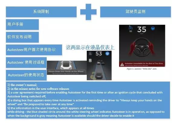 特斯拉以多个层次提供了系统局限性的信息,包括:1)用户手册;2)每次软件更新时候的更新说明,也指向用户手册;3)首次或一段时间后再次使用Autosteer之前,都有一个用户使用认可协议;4)每次Autosteer启动以后,仪表盘弹出对话框显示“请一直手扶方向盘”;5)用户界面呈现的信息,会在驾驶过程中一直显示,包括Autosteer的状态,亮白表示正在使用中,灰色代表现在是手动模式,但可以随时开启。