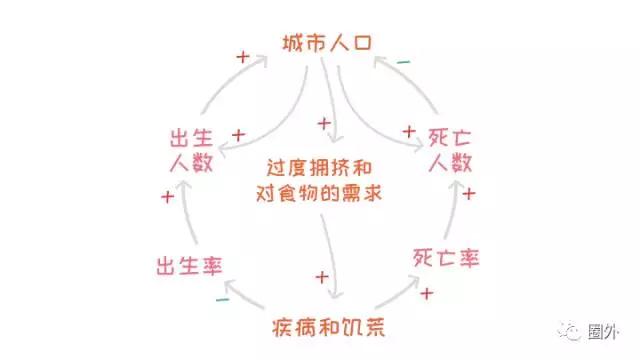 原本城市人口是个增强回路,因为总人口多了,新出生的人就多了,然后又增加了总人口。然而,人口增长还需要考虑死亡人数。