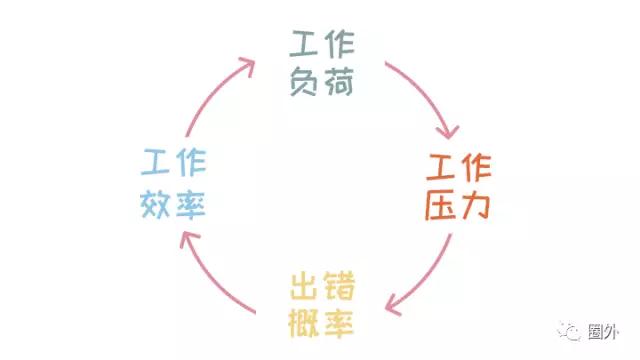 再比如工作量,我们会发现,在职场上,部分人的工作是恶性循环:他们的工作负荷看起来很大,工作压力随之增大,又因为工作压力太大,做事情很容易出错,导致工作效率降低(单位时间内能够处理的工作量小),然后工作负荷更大。