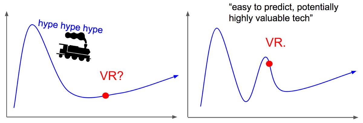 那么未来的VR是什么样的呢?从炒作曲线的角度来说,人们可能会认为在90年代的期望峰值之后,VR终于处于缓慢攀升的阶段了。但是我认为,某些技术(特别是上面的1)非常容易预测以及2)潜在影响力非常大)无论在这个领域发生了什么都可以经历多个周期。没有人想错过任何时候都可能出现的几百美金的B波。我认为我们现在的情况是:
