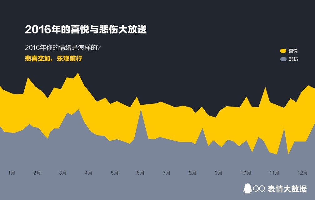 在前五名中,笑的表情发送次数占比更多。这也一定程度上代表了整个大盘,QQ表情大数据通过对已发送表情中“喜悦”表情和“悲伤”表情的总量统计,过去一年中QQ用户的“喜悦”总体上大于“悲伤”。