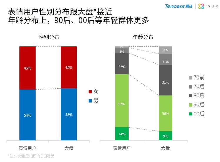 另外,因为觉得男女发表情总比例居然相差那么大,我查了一下QQ用户男女比例的组成,发现从去年发布的数据来看,男生占比确实是比女生大的哦;而且年龄越小发表情更频繁哦。