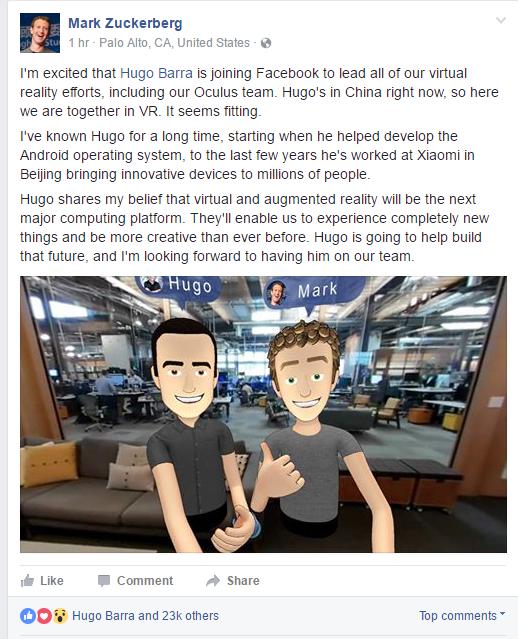 原小米副总裁Hugo Barra加入Facebook VR团队