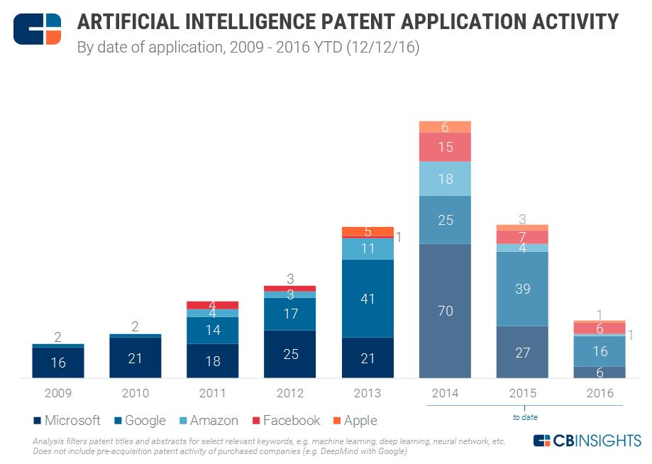 从AI专利的数量上,可以更直观地看出苹果的掉队。据CBinsight统计,2009年至今微软共计拥有200多项AI专利,从数量上占据第一的位置。谷歌从2011年起奋起直追,目前共计拥有150余项专利排在第二。亚马逊和Facebook紧随其后,而苹果共计15项专利排在尴尬的倒数第一。