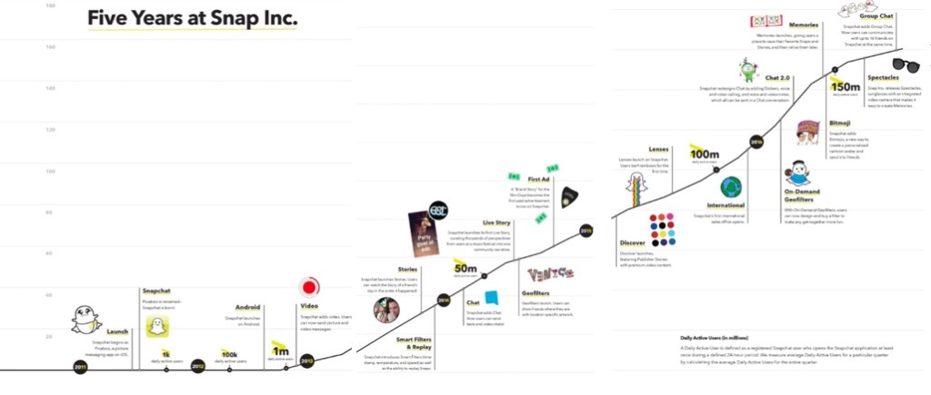 IPO文件显示,成立于2011年的Snapchat从最初的图片社交软件一路发展,不断增减新的功能和设备,直到最近推出的具有摄像功能的spectacle眼镜。最新数据显示,Snapchat的日活用户到2016年已经超过1.5亿。