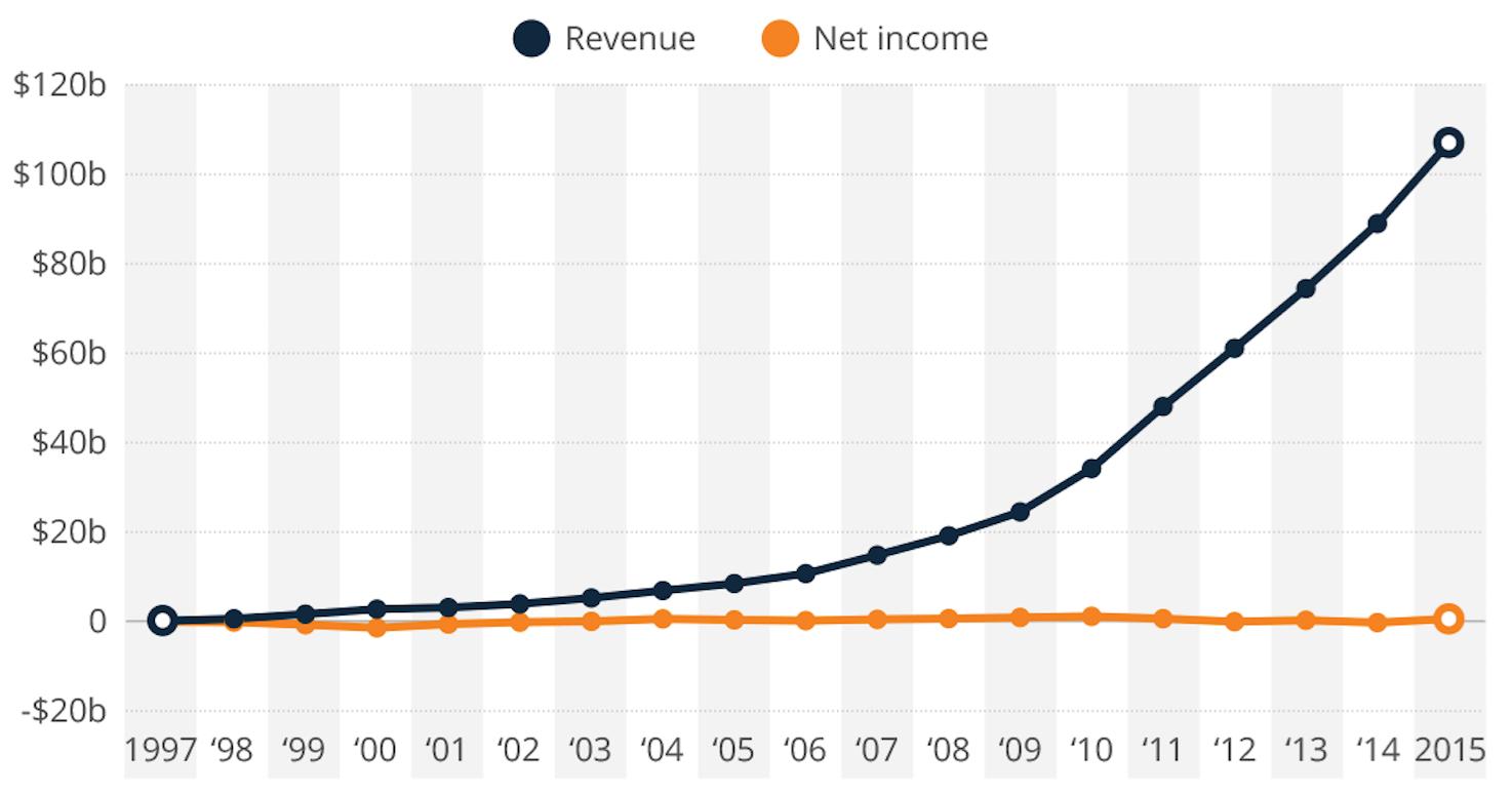 如下图表,我们可以看出,在过去的20年里,亚马逊的营业收入实现了近指数式的增长,但营利一直接近于零。