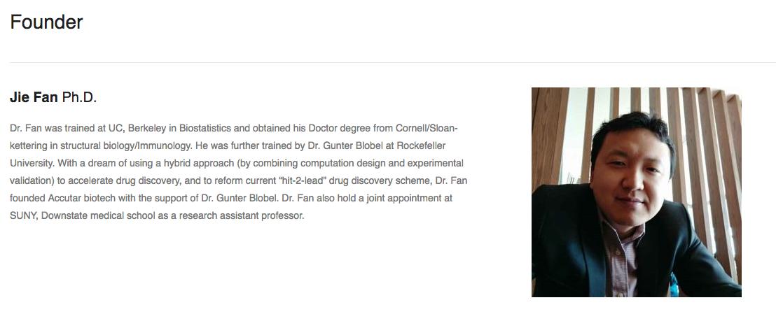 ( 注:图为AccutarBio创始人范捷。范捷中学期间获得国际生物奥赛银牌,本科毕业于复旦生物系,硕士就读于加州伯克利分校,博士期间师从 Nikola Paveletich,解析了RPA-DNA 复合物晶体结构;博后师从诺贝尔奖得主 Gunter BLobel,解析了核孔小体复合物的相关结构;获得 Robertson foundation 临床研究经费开发乳腺癌药物。)