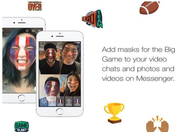超级碗激烈赛事的背后,社交巨头们对第二大屏幕的争夺也忙得不可开交。据华尔街日报报道,Facebook 在自家的聊天应用 Messenger 中添加了一个虚拟橄榄球头盔面具功能,打开相机,你可与好友视频或发送图片聊天,与此同时还能挑上你喜欢的虚拟面具让自己充当一把”橄榄球迷”。