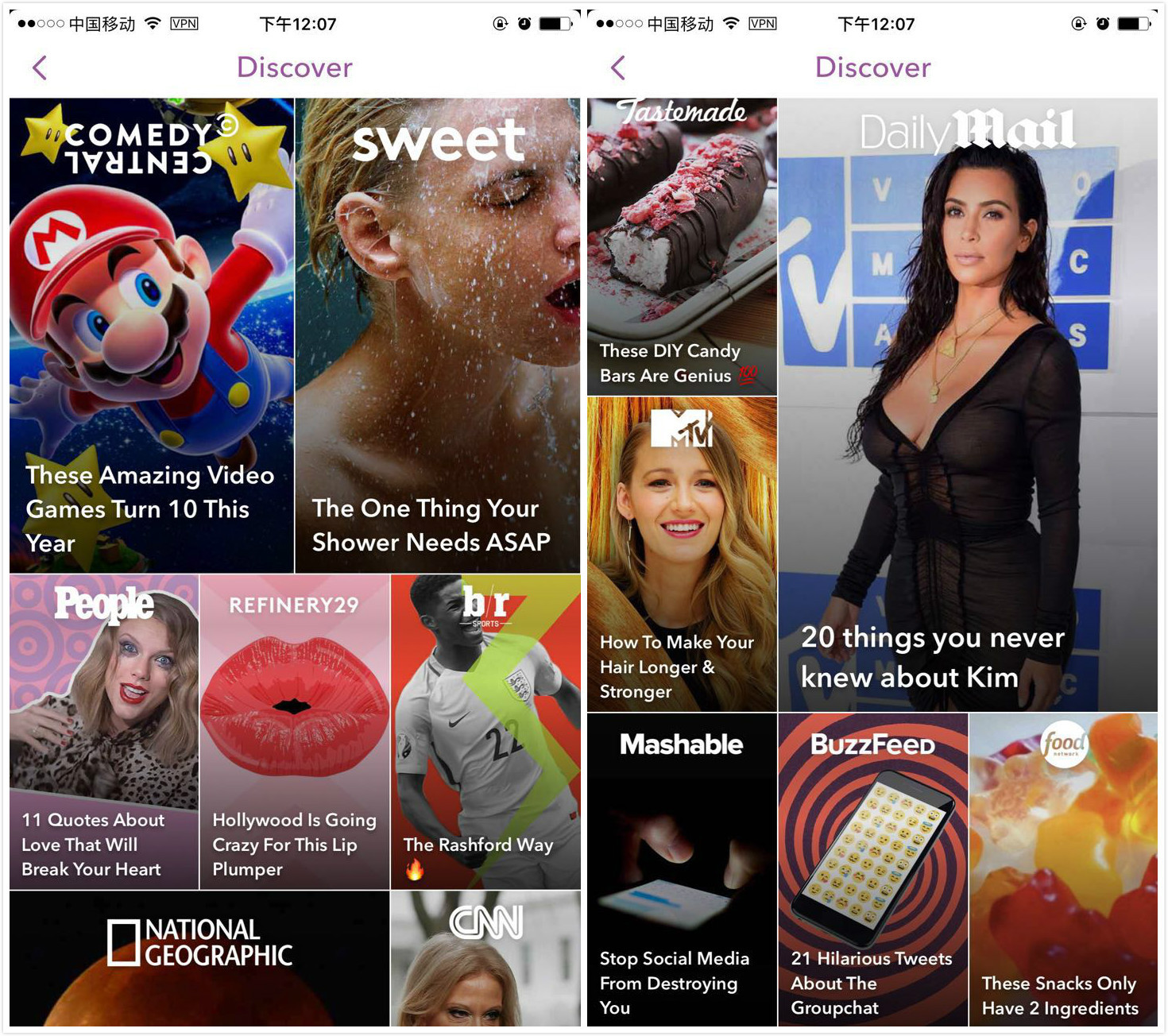 除了他在视频中介绍的内容,关于Snap人们想了解的内容还有很多,如公司如何在Snap视频中投放广告。另外,在Discover模块中,还可以看到Snap与众多内容商合作,如Daily Mail和National Geographic可以分享它们的内容和视频。