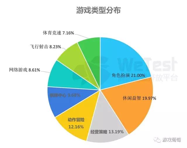 其中,角色扮演类游戏最多,占比21.00%,代表作有《梦幻西游》、《热血传奇》等;体育竞速类游戏最少,占比7.16%,以《天天酷跑》等酷跑、赛车类游戏为代表。