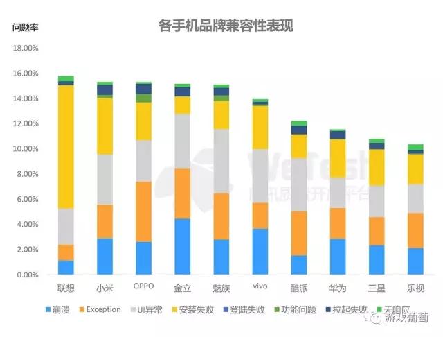 酷派、华为、三星、乐视手机问题率明显较低,说明这些手机的游戏兼容性较好,而问题率较高的一些品牌,需要游戏开发者尤其注意兼容情况。