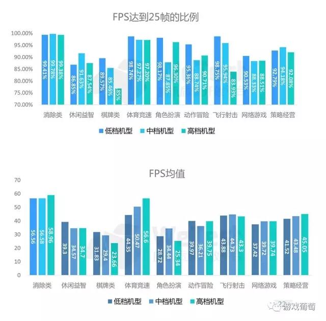 在平均FPS方面,消除类和体育竞速类游戏表现相比之下更为优秀,这两个类别下的不达标游戏数量也极少。棋牌类游戏在高档机型上FPS均值跌过25,只有23.66,不达标的游戏数量也超过了三成,虽然用户体验上影响不大,但仍需引起注意。