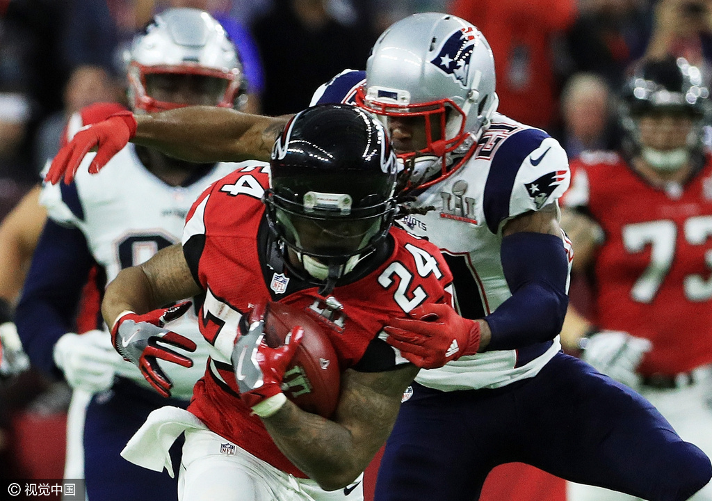 比赛激烈地进行着,爱国者和亚特兰大猎鹰球队队员还在贴身肉搏。