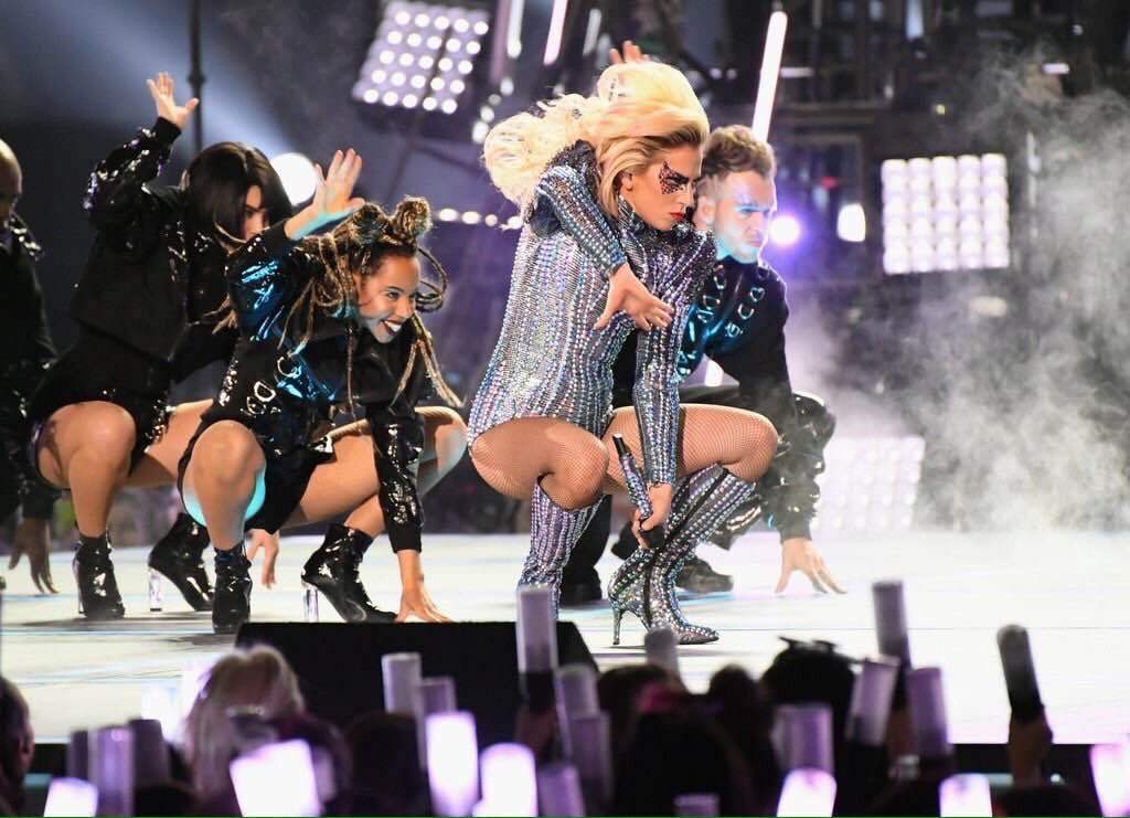 除了激动人心、扣人心弦的比赛外,固定 12 分钟的中场休息表演亦是每年的重头戏,顶级巨星迈克尔·杰克逊、麦当娜、碧昂斯都曾登台献艺。今年在超级碗上担任表演嘉宾的是 Lady Gaga ,这位以搞怪、创新、大胆的百变天后,在正式比赛开始前,就身穿黑色薄纱长裙,在草地上撩裙大摆 pose,“霸气侧漏”。