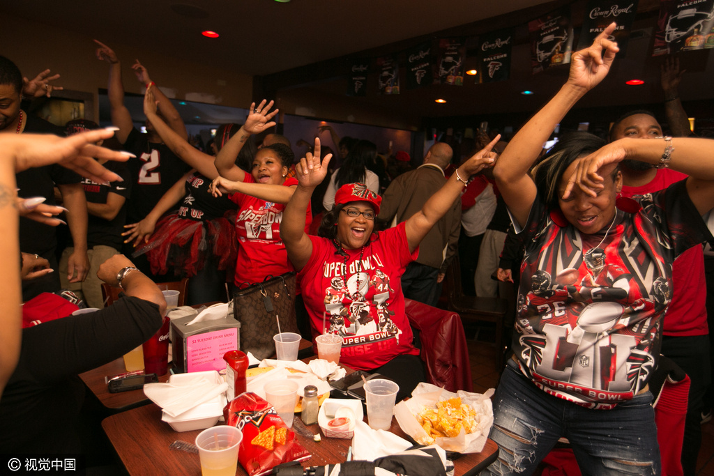没法去现场的球迷们也没闲着,聚集众好友边吃喝边看直播。她们为各自支持的球队时而欢呼,时而焦急。下图为亚特兰大球迷欢呼雀跃。
