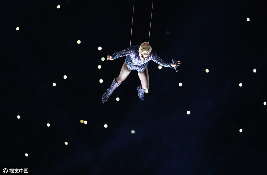 中场休息的表演 Gaga 也丝毫不负众望。美国国歌演唱完后,Lady Gaga 一身亮蓝色紧身战袍加长靴惊艳亮相。以三百架无人机闪烁的璀璨“星光”做背景, Gaga 放声高歌,动情间歇时直接从高空一跃而下。