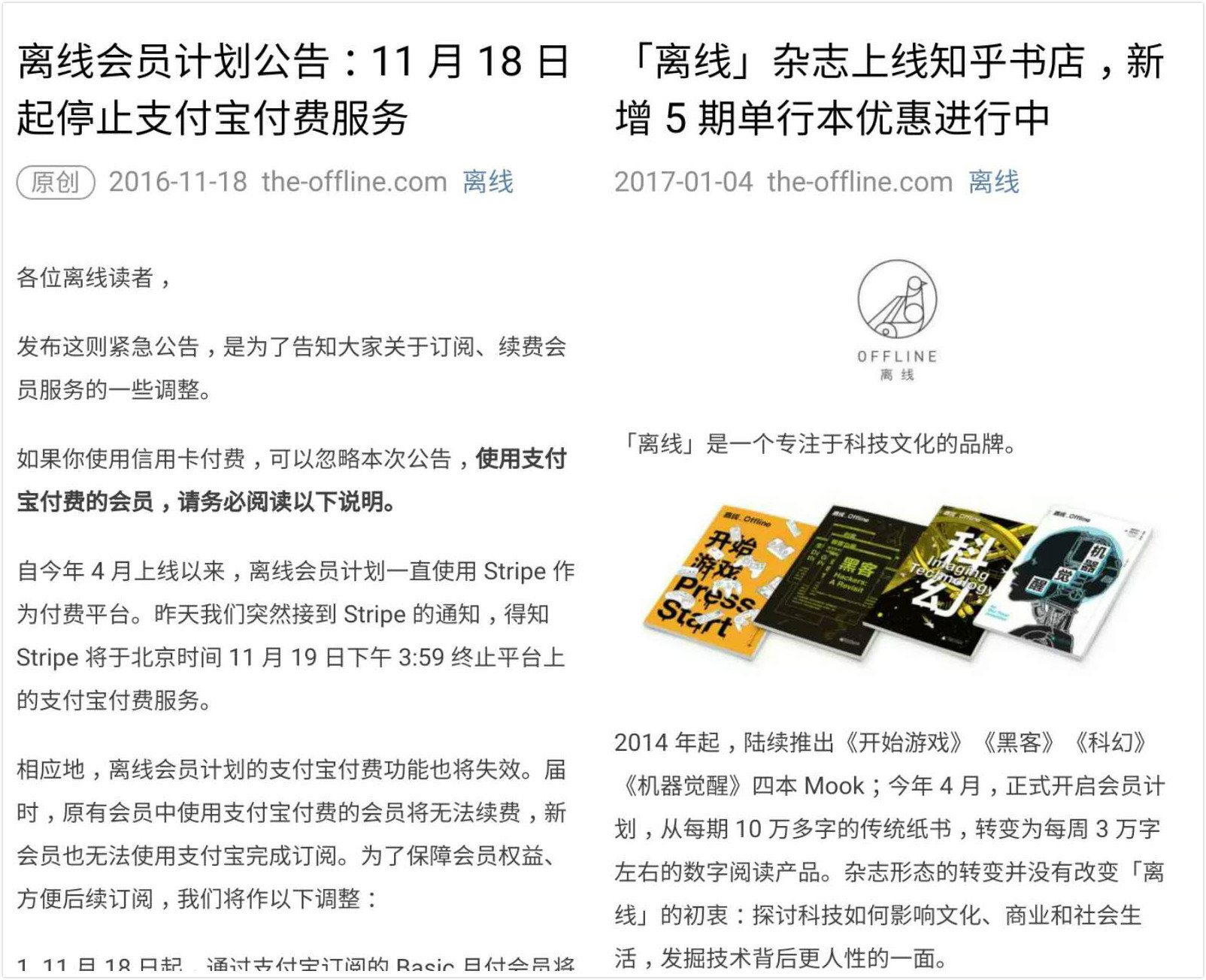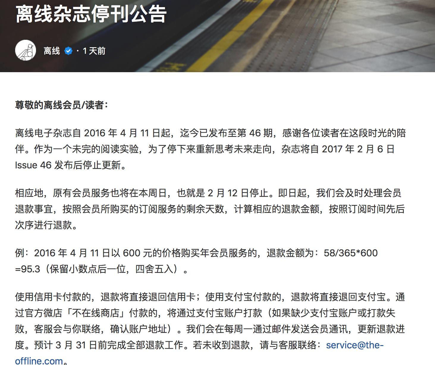 除此之外,《离线》的运营受制于人员、经费不足的限制,屡屡出错,线上订阅到后期只能用信用卡,最常见的微信、支付宝支付在 Web 端与世隔绝,即使想为内容付费,也往往被繁琐的流程折腾到没耐心,更不必提我前文所述的那套冗杂的寻找官网过程。