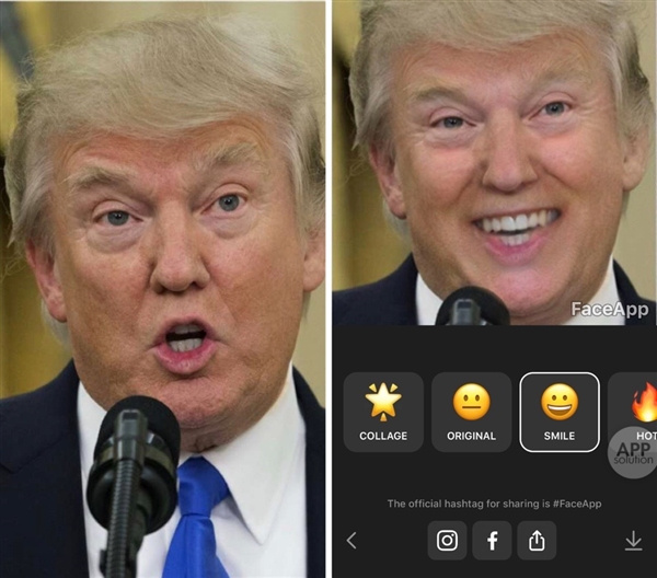这款FaceApp的功能是,利用人工智能技术处理图片,可以将本来目无表情的人表情换成笑容、将人变性、变性感,或者变老、变年轻。