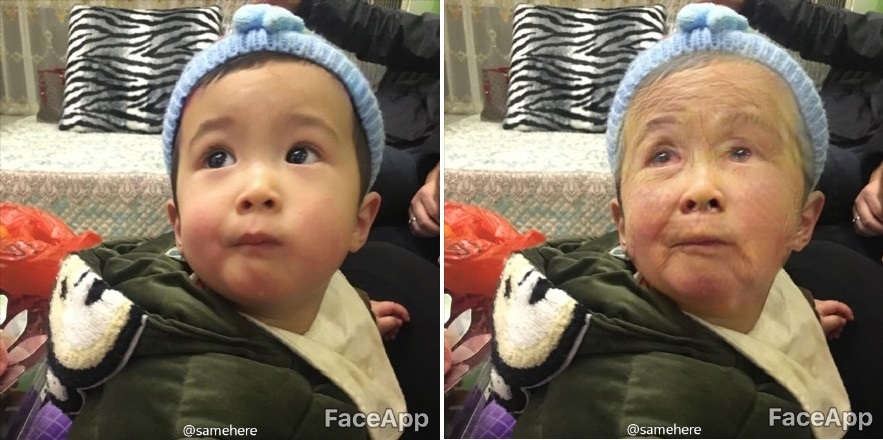 不过,这个软件的效果好像不是总是如此顺利,也许是因为训练模型的时候用得都是歪果仁的脸,所以我氪星人在尝试变老的时候,发现老了的他成了歪果仁;而且不知道是不是因为背景太花,软件在识别头发的时候受到干扰,他有一圈头发还是黑的。至于我们呆萌的成城,老了之后有种怪怪的赶脚……