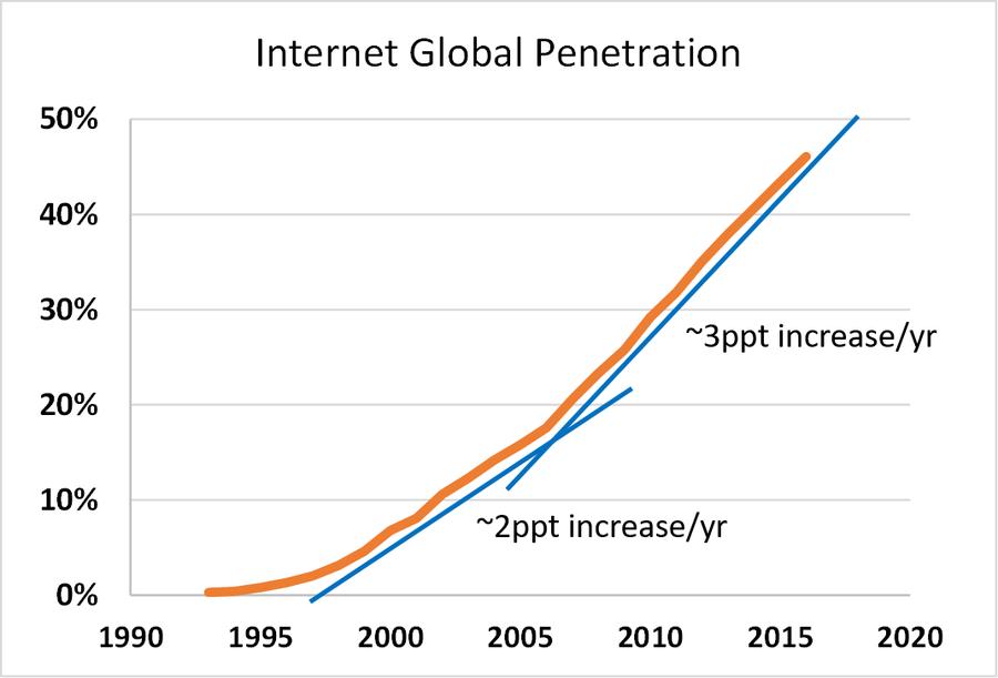 如果能更加仔细地看互联网应用曲线,我们会惊讶的看到21世纪后期的转折点走向更高的采用率。这是什么造成的?随着PC的繁荣,线性增长的第一个主要趋势发生在1998年到2007年。随着移动通讯的繁盛,第二个线性增长的主要趋势以更高的速度从2007年持续到今天。这是由印度、中国和南美洲推动的,移动网络在贫困地区或农村地区的电力、电话和其他基础设施方面存在巨大差距。毫无疑问,使用移动互联网将有助于推动完成全球识字率的最后旅程。