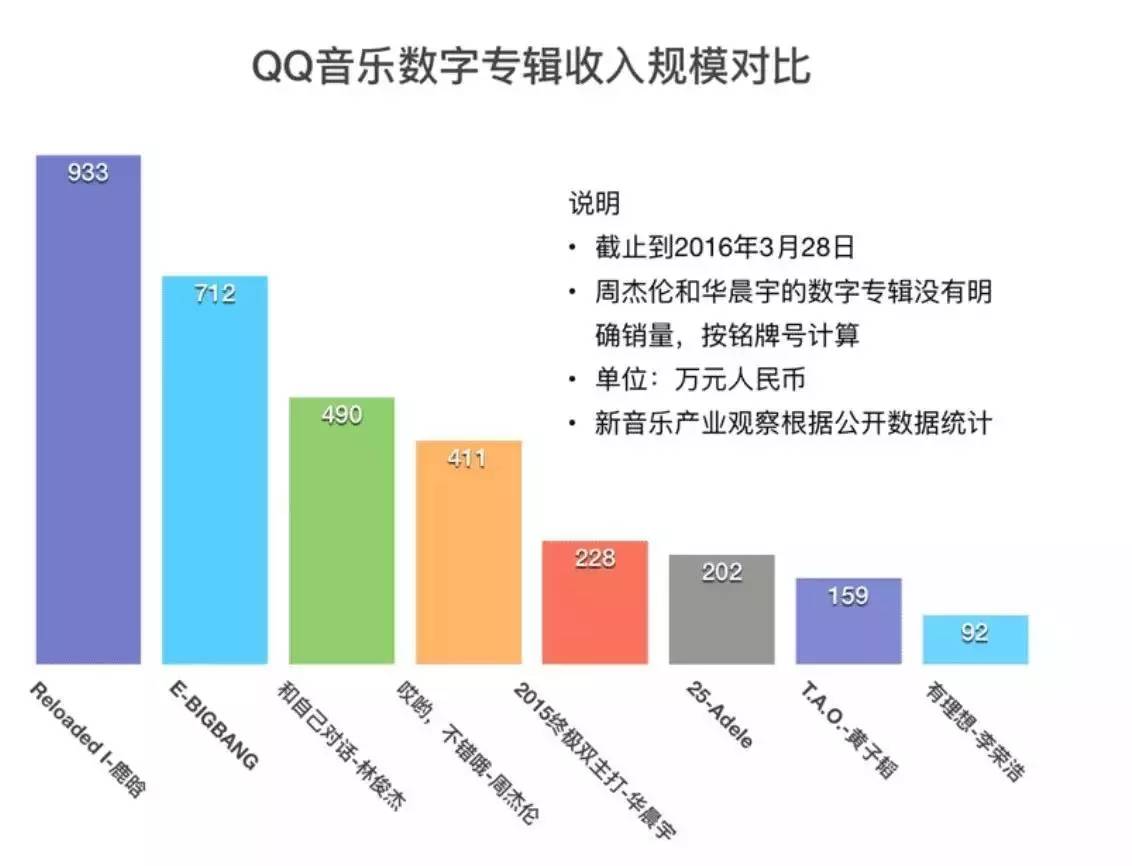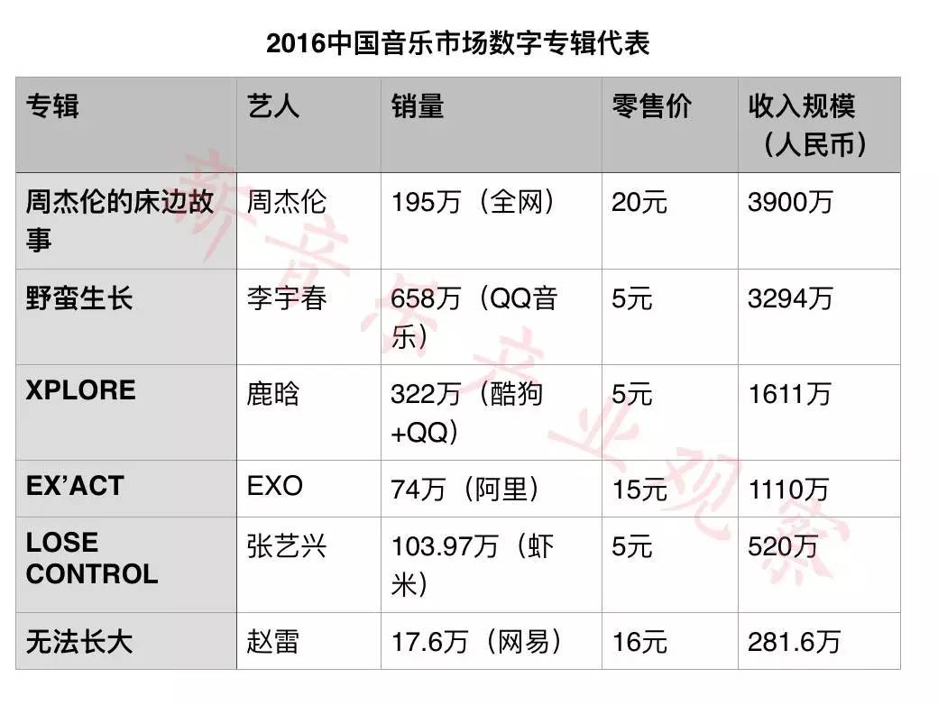 2015年,QQ音乐是最主要的数字专辑消费平台,这也是因为他们是数字专辑消费的推动者。到2016年,数字专辑消费已经覆盖到全平台,规模也有较快增长。2015年,数字专辑消费规模约3000万人民币,到2016年,规模扩大到约1.2亿,涨幅高达400%。(单是上面这几张数专的消费规模就破亿了,这还没算上去年的一些重点专辑,比如五月天、田馥甄、林宥嘉等,还有陈粒、陈奕迅和张杰的数字单曲销量也不小)