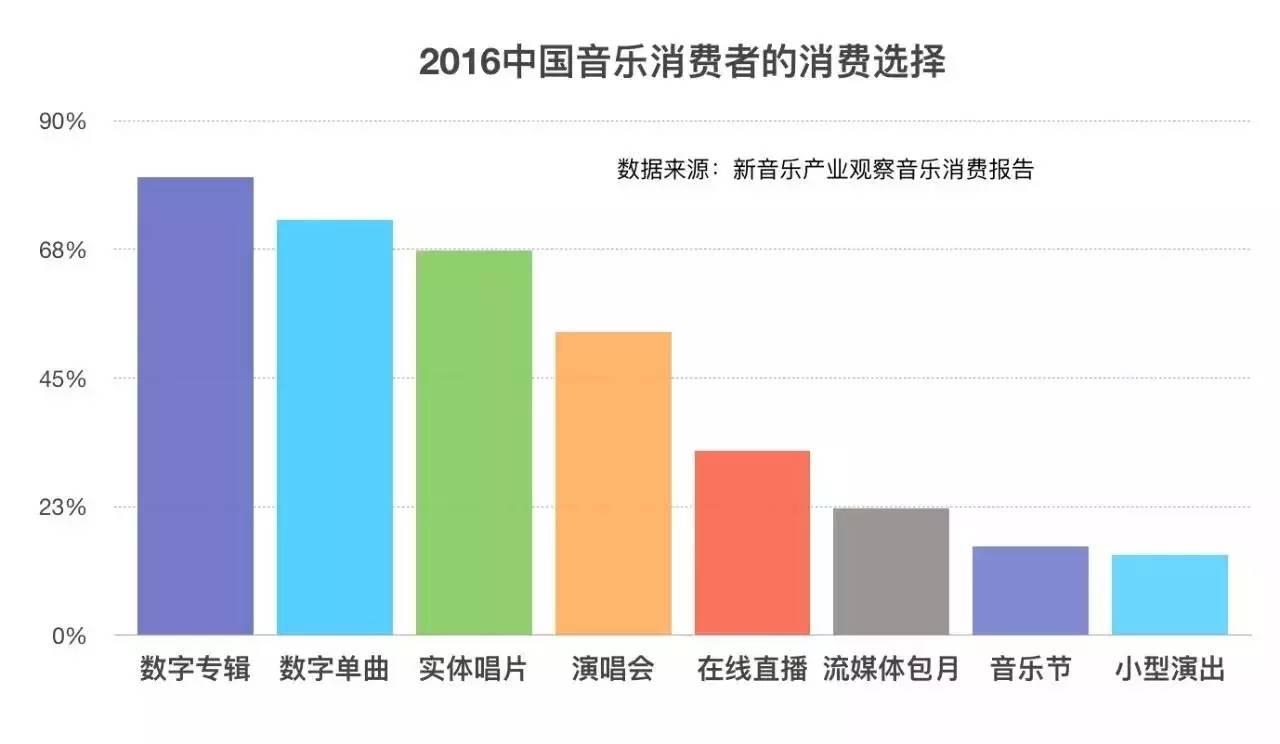2016年,在所有消费过音乐的受访者中,有超过80%的人消费过数字专辑,超过70%的人消费过数字单曲,将近68%的人消费过实体唱片,消费过音乐节和小型演出(Livehouse、剧场等)的人比较少。