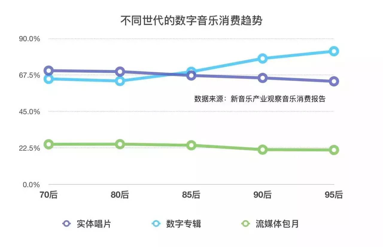 未来3-5年,90后(包括95后,下同))将成为音乐消费的主力,他们对于音乐消费的选择非常重要。从上图的趋势看,从70后-90后,数字专辑的消费比例不断增加,而且90后的数字专辑消费比例非常高,其中95后受访者中,消费过数字专辑的人将近90%。
